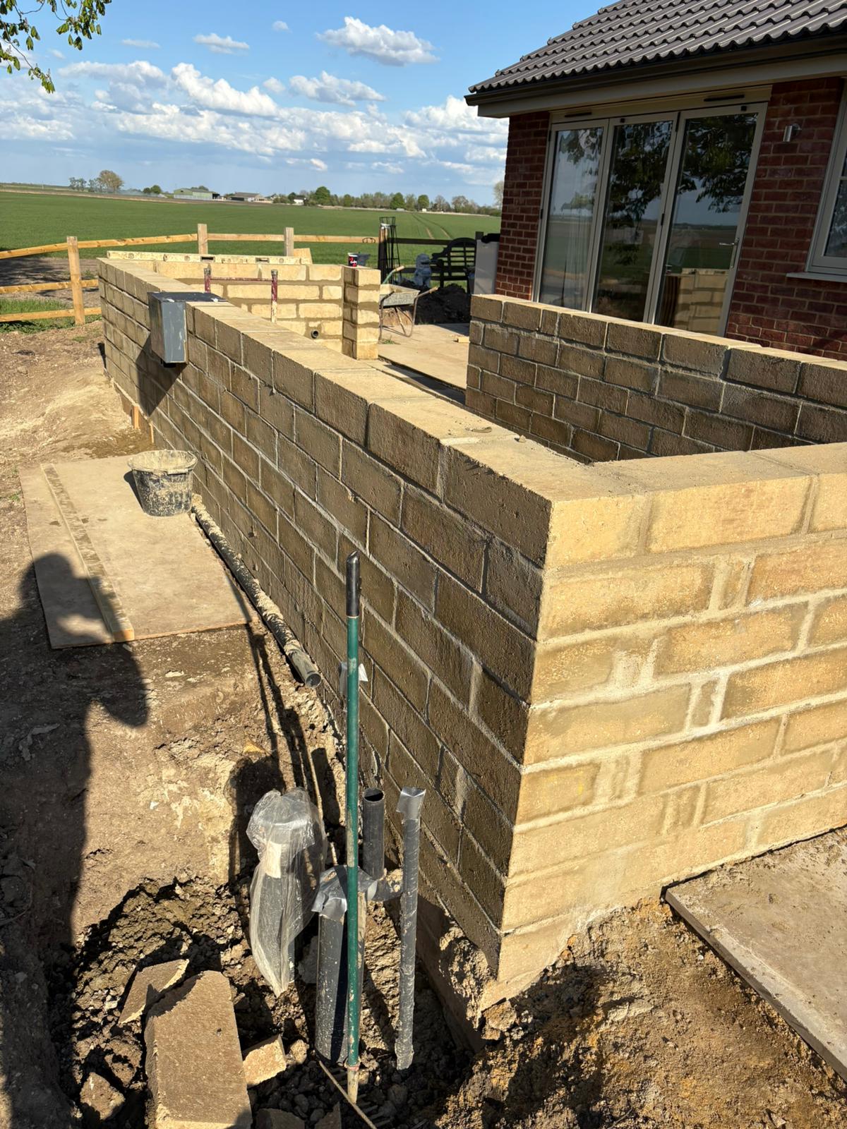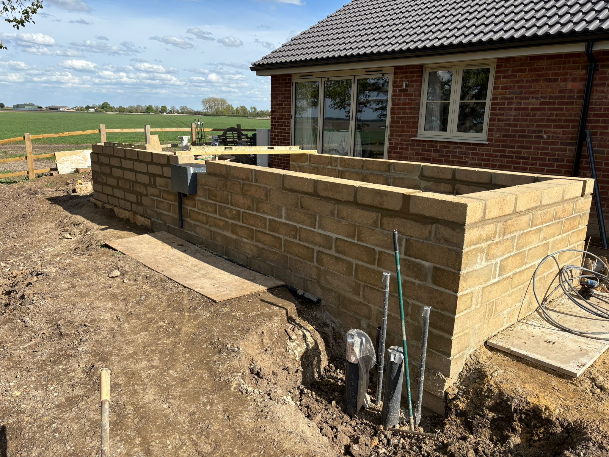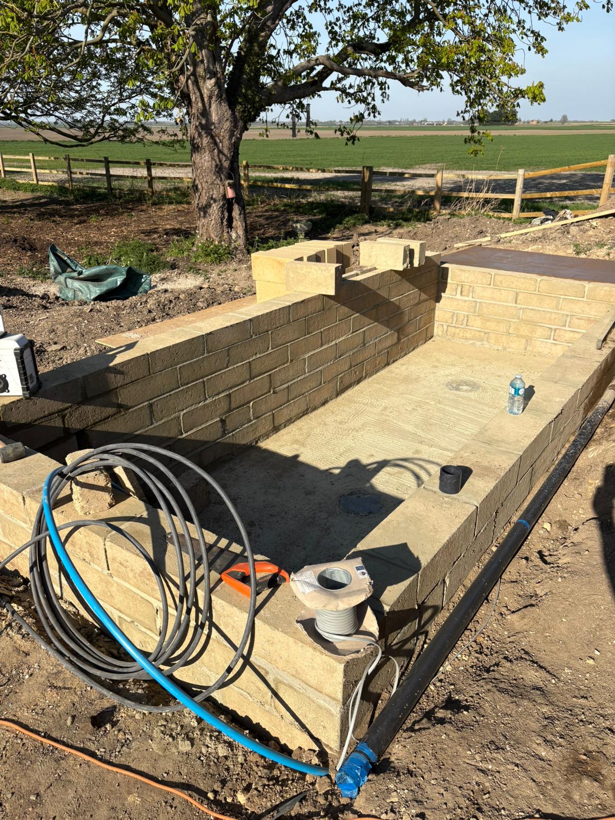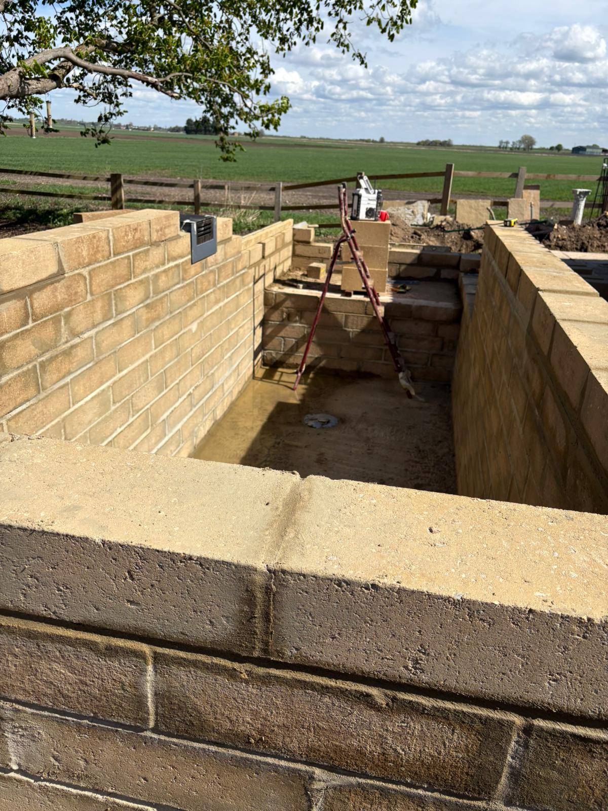 A raised brick pond in open field, with a traditional brick design.