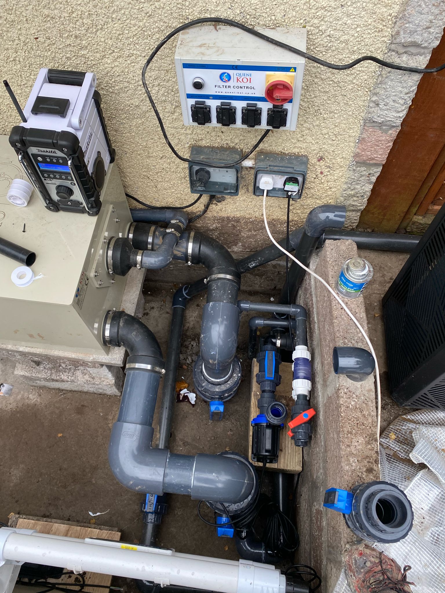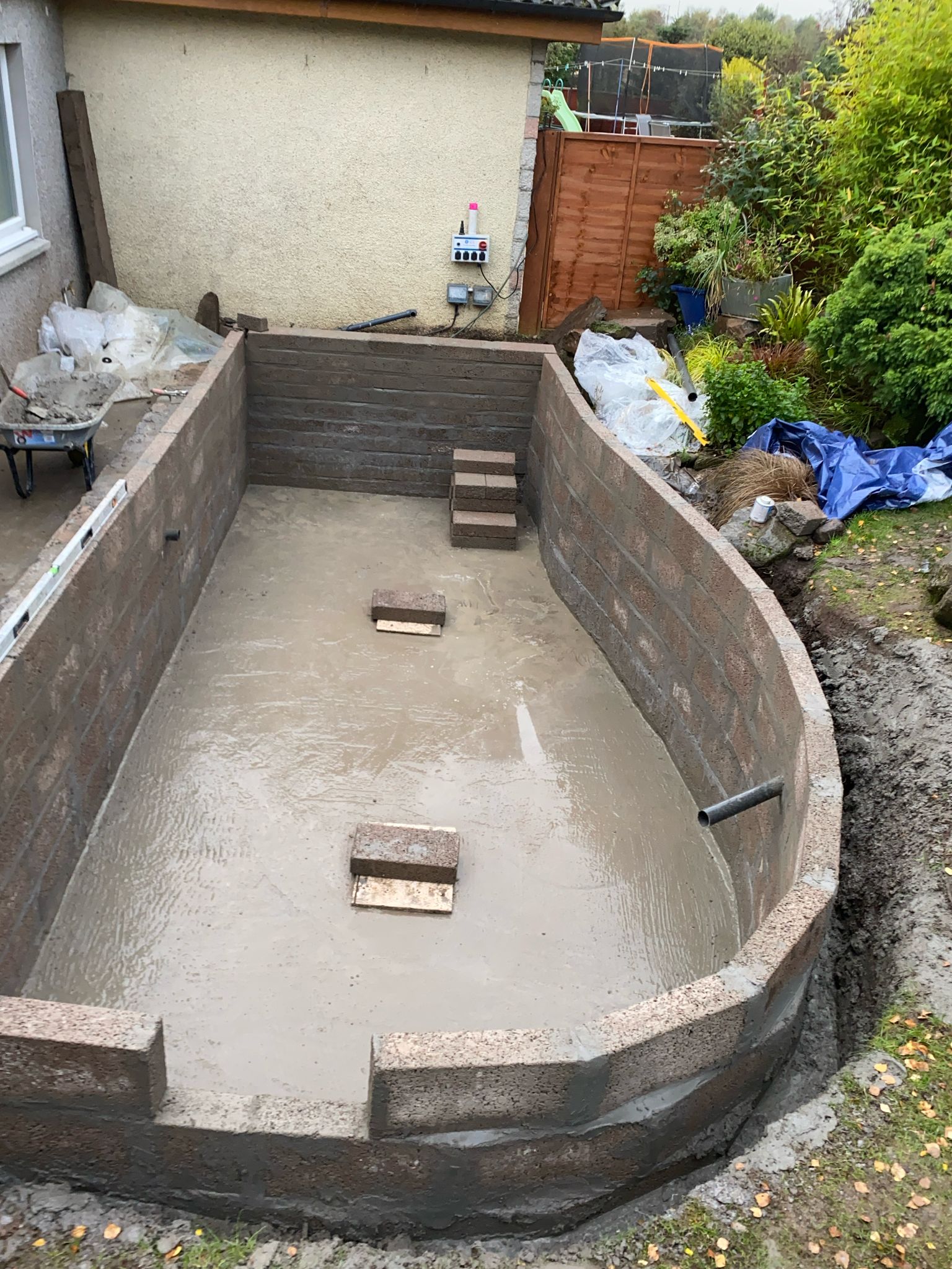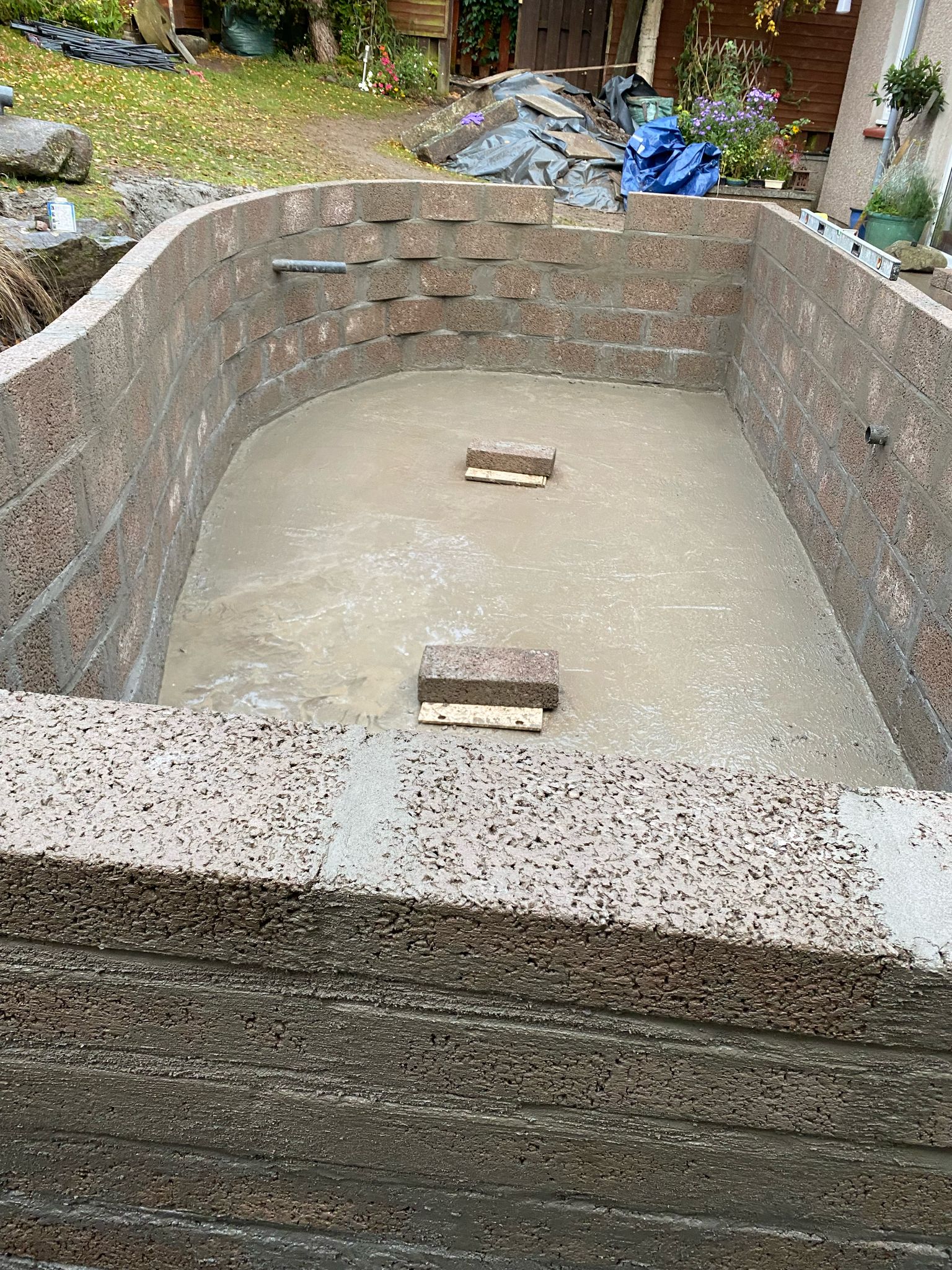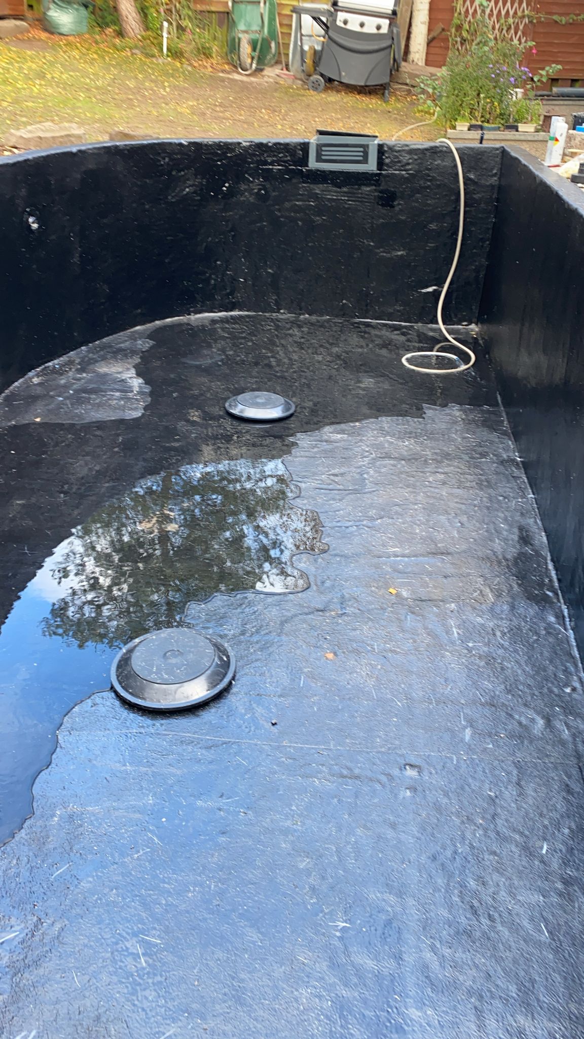 A stylish koi pond with a glass panel, integrated into a modern decked seating area for a relaxing outdoor space.