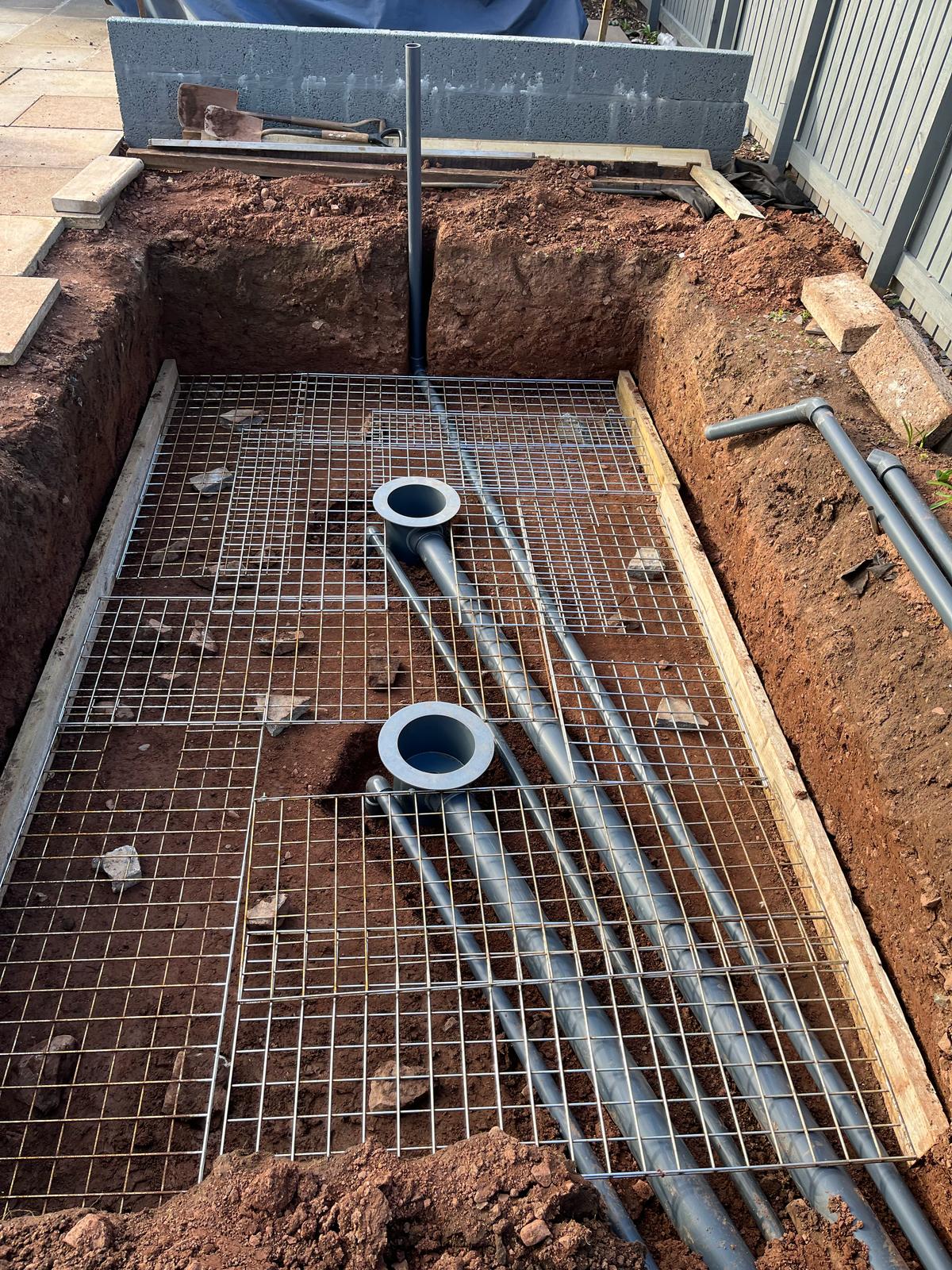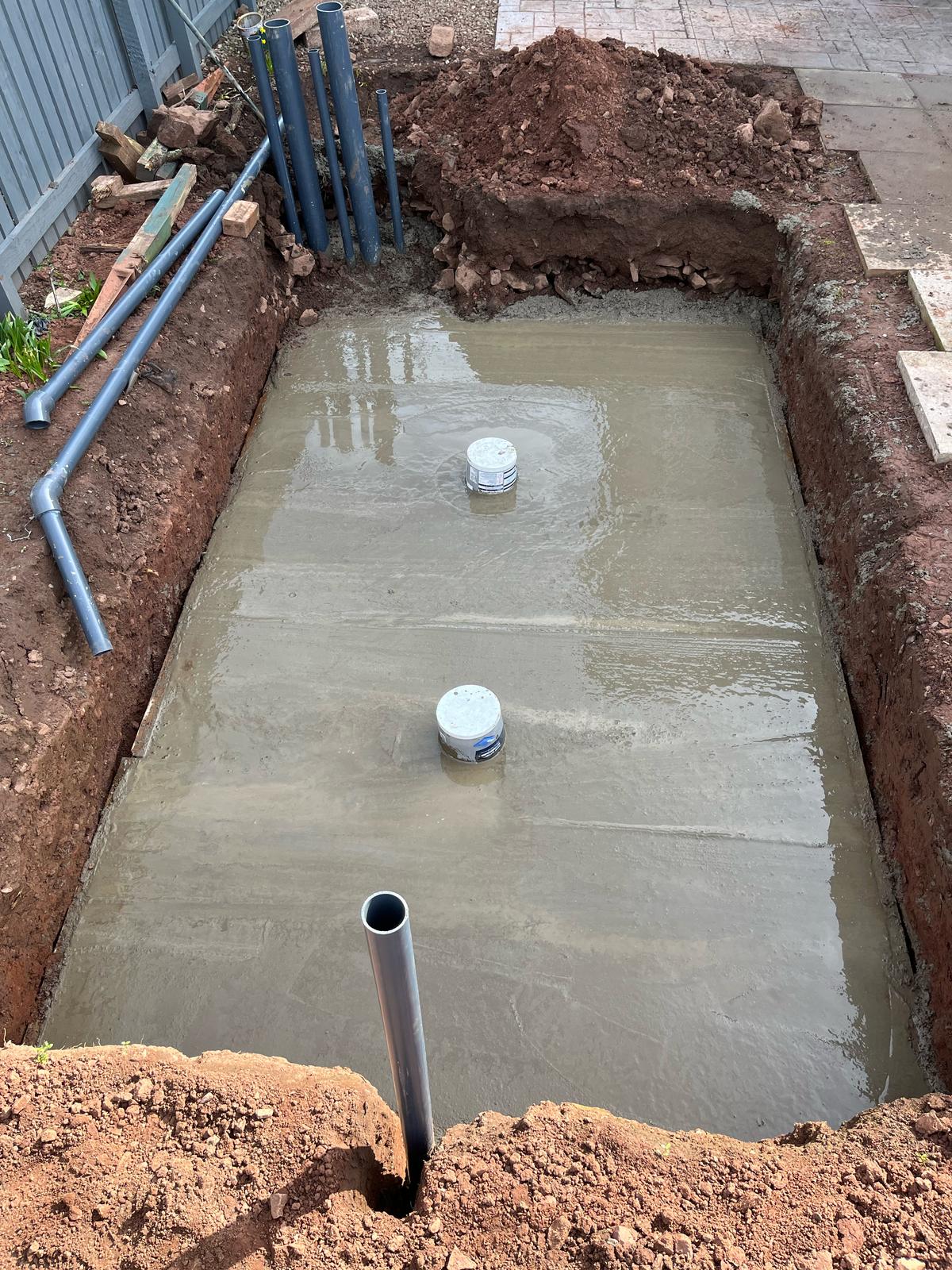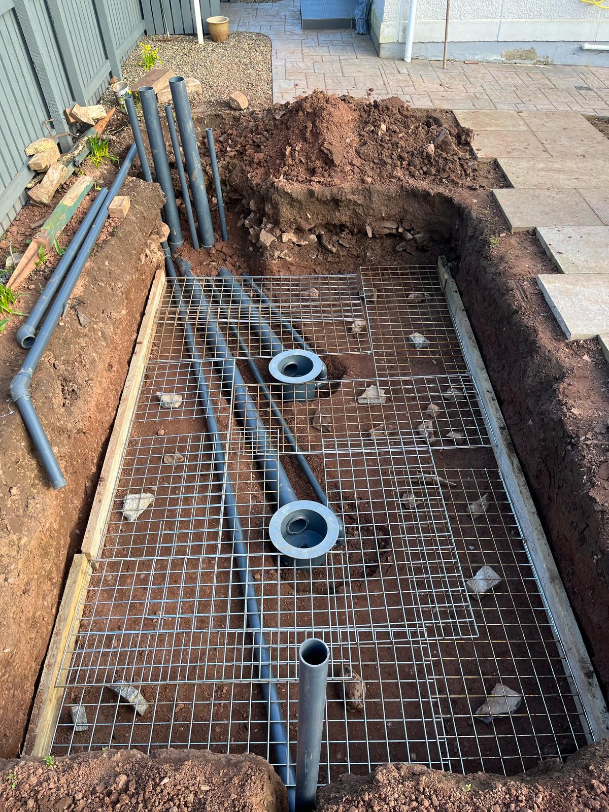 A partially built blockwork pond structure, preparing for filtration and finishing touches.