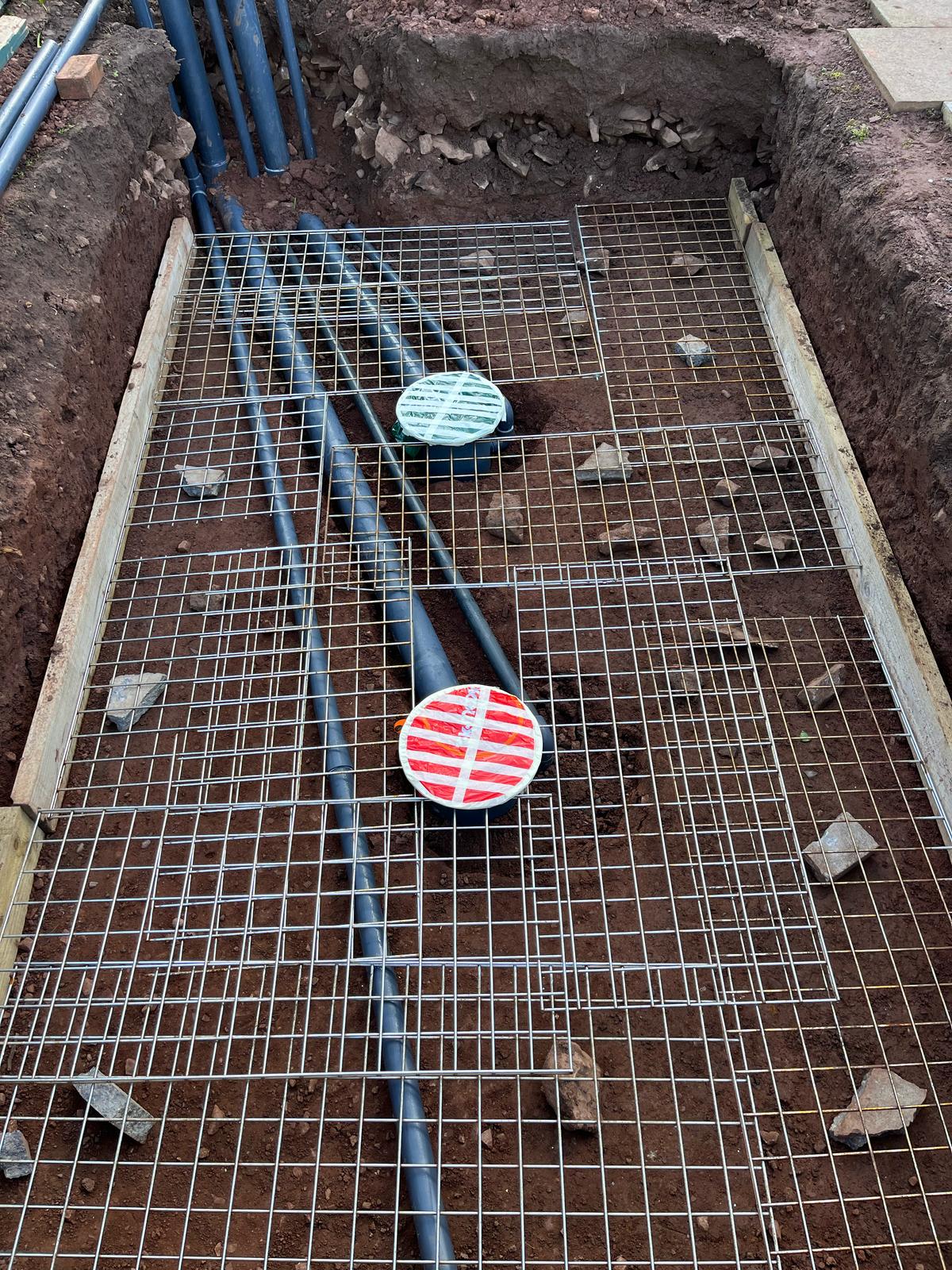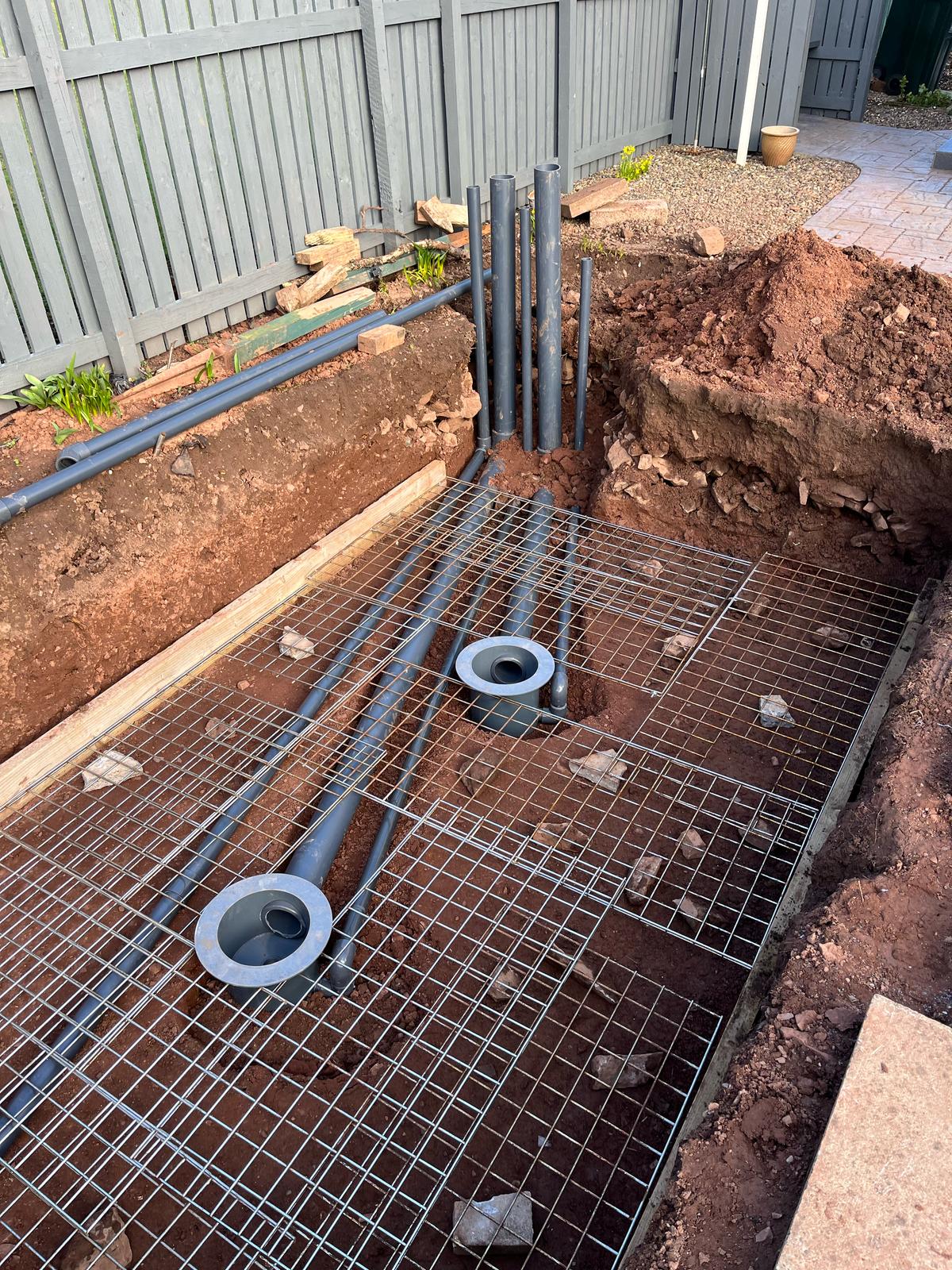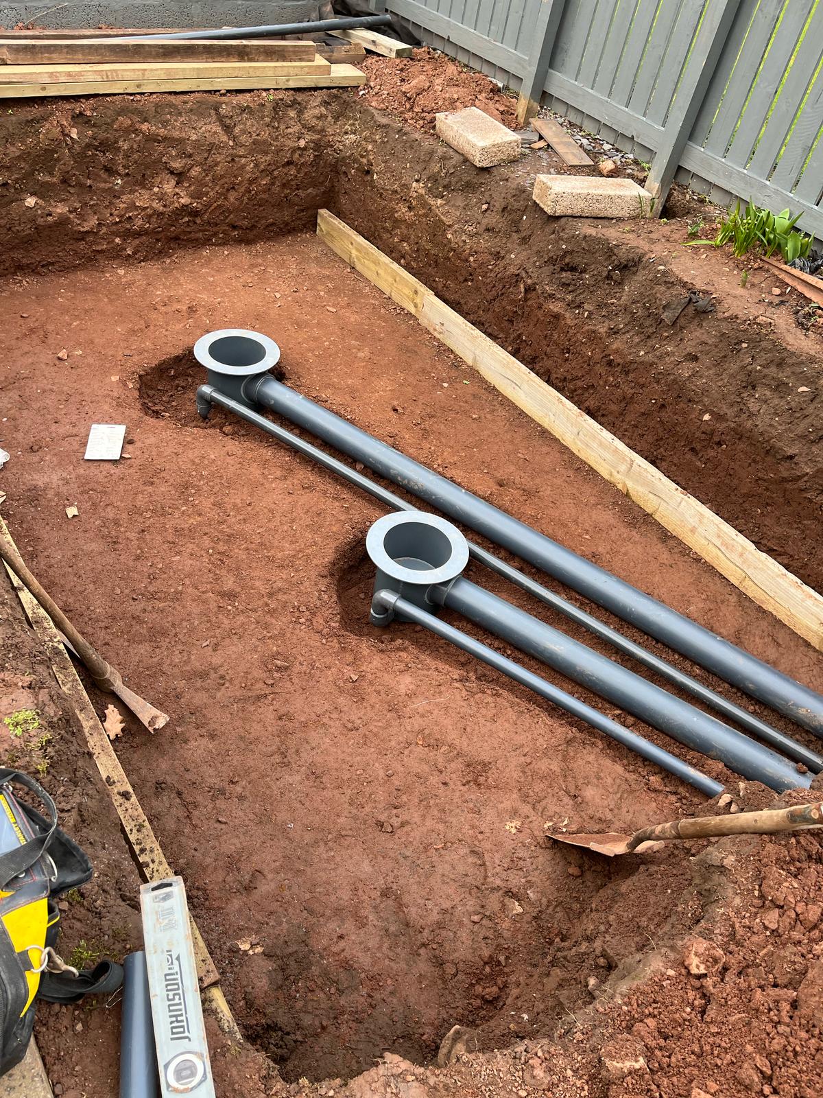 A partially built blockwork pond structure, preparing for filtration and finishing touches.